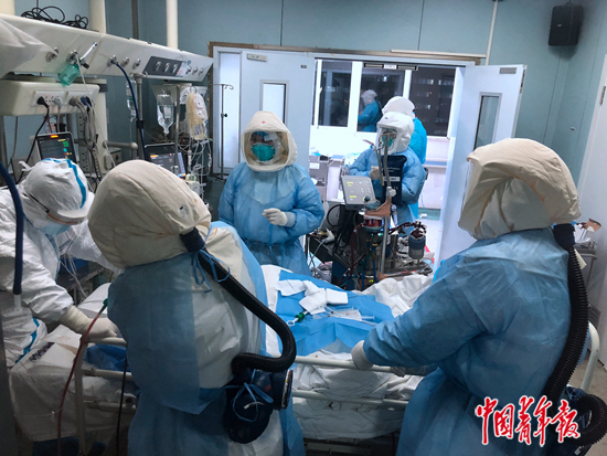 3月9日,在金銀潭南樓的重癥ICU病房內,醫護人員正在對一名呼吸困難的新冠肺炎患者進行纖支鏡手術。