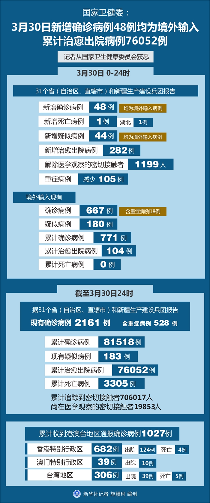 截至3月30日24時(shí),據(jù)31個(gè)省(自治區(qū)、直轄市)和新疆生產(chǎn)建設(shè)兵團(tuán)報(bào)告,現(xiàn)有確診病例2161例(含重癥病例528例),現(xiàn)有疑似病例183例。累計(jì)確診病例81518例,累計(jì)治愈出院病例76052例,累計(jì)死亡病例3305例,累計(jì)追蹤到密切接觸者706017人,尚在醫(yī)學(xué)觀察的密切接觸者19853人。