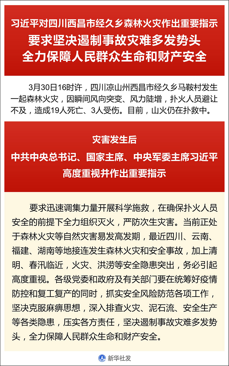 災害發生后,中共中央總書記、國家主席、中央軍委主席習近平高度重視并作出重要指示,要求迅速調集力量開展科學施救,在確保撲火人員安全的前提下全力組織滅火,嚴防次生災害。當前正處于森林火災等自然災害易發高發期,最近四川、云南、福建、湖南等地接連發生森林火災和安全事故,加上清明、春汛臨近,火災、洪澇等安全隱患突出,務必引起高度重視。各級黨委和政府及有關部門要在統籌好疫情防控和復工復產的同時,抓實安全風險防范各項工作,堅決克服麻痹思想,深入排查火災、泥石流、安全生產等各類隱患,壓實各方責任,堅決遏制事故災難多發勢頭,全力保障人民群眾生命和財產安全。