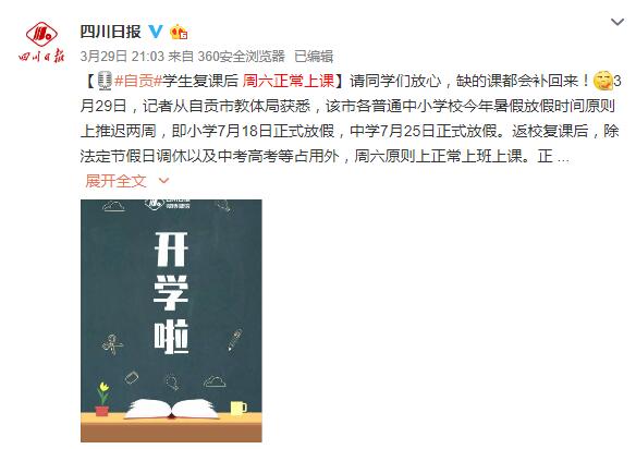 今年2月,四川就曾下發(fā)通知明確:中小學(xué)因延遲開學(xué)耽誤的教學(xué)時(shí)間,可通過調(diào)整周末和暑期等方式補(bǔ)齊。