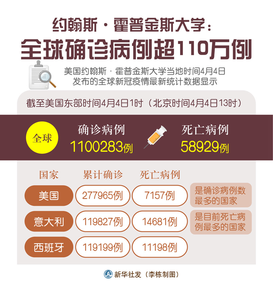 新華社華盛頓4月4日電 美國約翰斯·霍普金斯大學4日發布的全球新冠疫情最新統計數據顯示,全球累計確診病例數已超過110萬例。