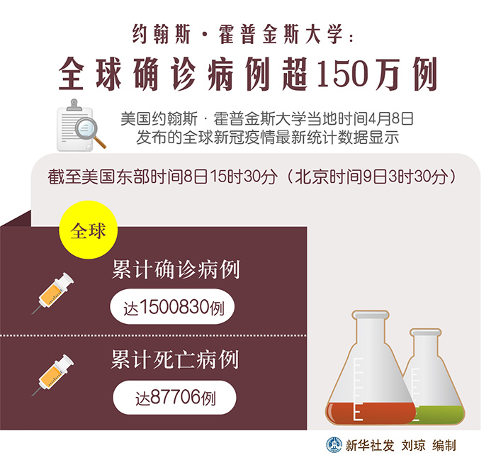 新華社紐約4月8日電? 美國約翰斯·霍普金斯大學8日發布的新冠疫情最新統計數據顯示,全球確診病例累計超過150萬例。