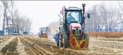 今年備春耕,吉林省農(nóng)安縣哈拉海鎮(zhèn)創(chuàng)業(yè)村農(nóng)民楊守奎帶領(lǐng)合作社五十來(lái)戶農(nóng)民,開著拖拉機(jī),拖掛上埋管機(jī)器,把兩指多寬的黑色滴灌膠管埋進(jìn)壟里。