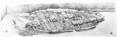 早期的考古現(xiàn)場(chǎng)都會(huì)采用帶有透視方法的素描速寫(xiě)方法進(jìn)行現(xiàn)場(chǎng)記錄。半坡遺址、廣州南越王墓考古現(xiàn)場(chǎng)都曾專門請(qǐng)畫(huà)家到現(xiàn)場(chǎng)繪制素描圖。此圖繪制于2015年12月。作為現(xiàn)場(chǎng)發(fā)掘的參與者,作者負(fù)責(zé)現(xiàn)場(chǎng)測(cè)繪和畫(huà)圖的工作,每天都留意著沉船隨著發(fā)掘進(jìn)度而產(chǎn)生的變化。