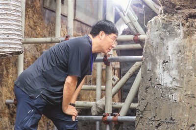 這張照片拍攝于2020年4月26日。考古隊(duì)員拍到了他們領(lǐng)隊(duì)崔勇做現(xiàn)場(chǎng)評(píng)估的場(chǎng)景。在沉船的外圍,已經(jīng)進(jìn)展到發(fā)掘外側(cè)反斜面位置,此時(shí)支護(hù)要預(yù)防船向下和向外的移位。支架太疏帶來(lái)風(fēng)險(xiǎn),太密則會(huì)影響發(fā)掘。 鄧嘉韶?cái)z