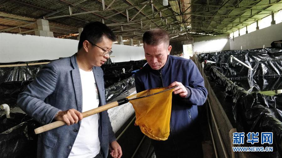 廣西上林縣西燕鎮(zhèn)岜獨(dú)村駐村第一書記康勇(左一)在龜鱉養(yǎng)殖場和養(yǎng)殖能人交流(4月24日攝)。 新華社記者 農(nóng)冠斌 攝