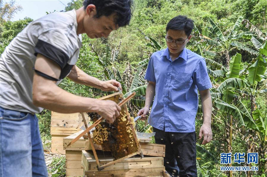 廣西樂業(yè)縣新化鎮(zhèn)百坭村扶貧工作隊(duì)員譚天社(右)與村民班華六在查看蜂巢(4月20日攝)。 新華社記者 曹祎銘 攝