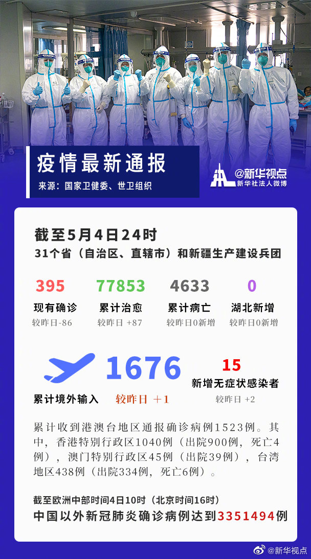 截至5月4日24時,據(jù)31個省(自治區(qū)、直轄市)和新疆生產(chǎn)建設(shè)兵團(tuán)報告,現(xiàn)有確診病例395例(其中重癥病例29例),累計(jì)治愈出院病例77853例,累計(jì)死亡病例4633例,累計(jì)報告確診病例82881例,現(xiàn)有疑似病例2例。累計(jì)追蹤到密切接觸者735240人,尚在醫(yī)學(xué)觀察的密切接觸者7152人。