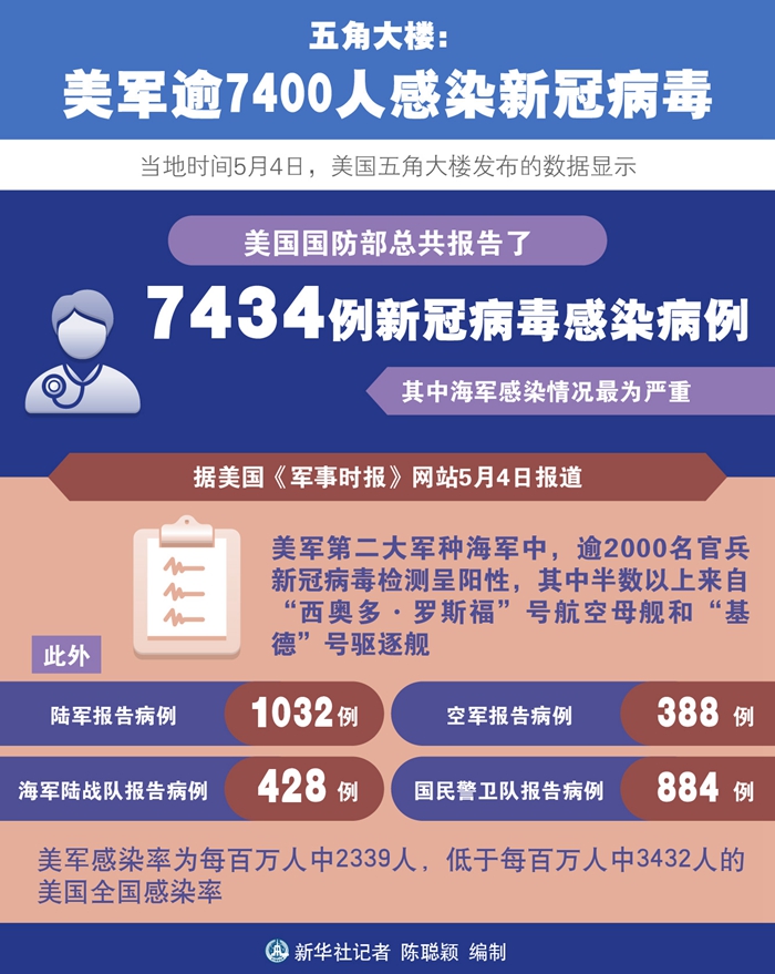 新華社華盛頓5月4日電(記者徐劍梅 鄧仙來)美國五角大樓4日發布的數據顯示,截至目前,美國國防部總共報告了7434例新冠病毒感染病例,其中海軍感染情況最為嚴重。