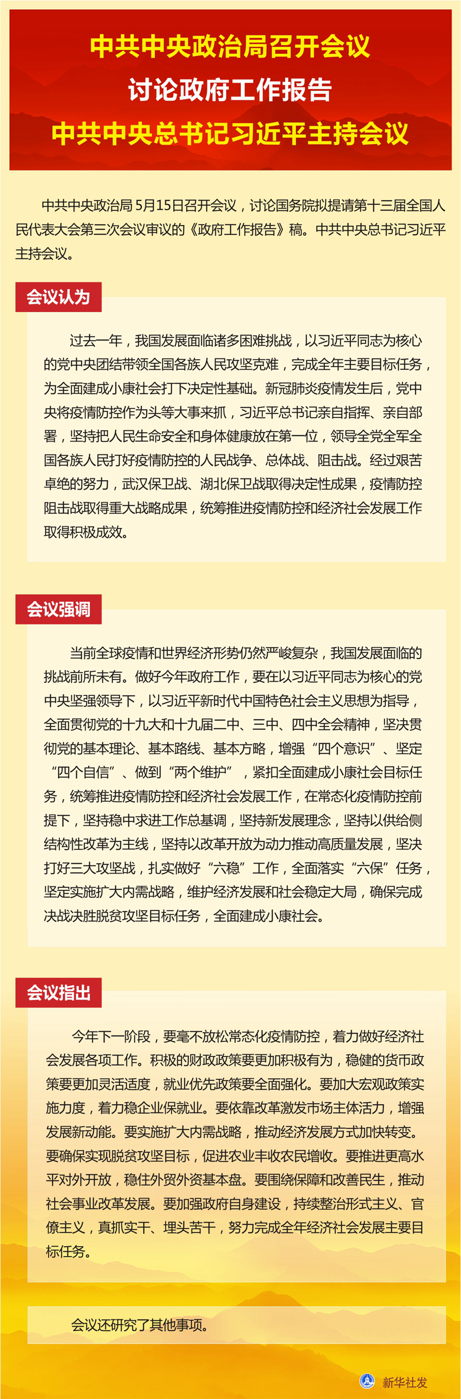 新華社北京5月15日電 中共中央政治局5月15日召開會(huì)議,討論國務(wù)院擬提請(qǐng)第十三屆全國人民代表大會(huì)第三次會(huì)議審議的《政府工作報(bào)告》稿。中共中央總書記習(xí)近平主持會(huì)議。