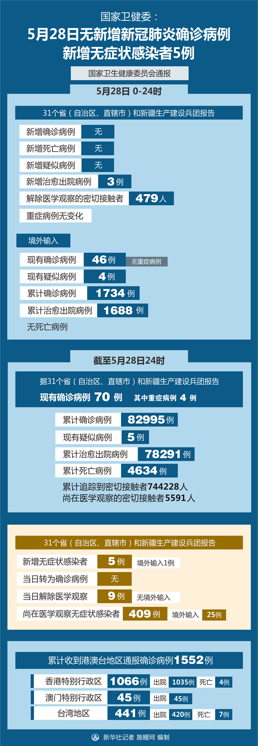 新華社北京5月29日電 國家衛(wèi)健委29日通報,5月28日0—24時,31個省(自治區(qū)、直轄市)和新疆生產(chǎn)建設(shè)兵團報告無新增新冠肺炎確診病例;無新增死亡病例;無新增疑似病例;新增無癥狀感染者5例。