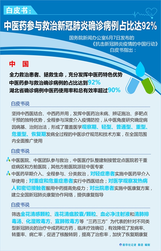 白皮書說,中醫醫院、中醫團隊參與救治,中醫醫療隊整建制接管定點醫院若干重癥病區和方艙醫院,其他方艙醫院派駐中醫專家。中醫藥早期介入、全程參與、分類救治,對輕癥患者實施中醫藥早介入早使用;對重癥和危重癥患者實行中西醫結合;對醫學觀察發熱病人和密切接觸者服用中藥提高免疫力;對出院患者實施中醫康復方案,建立全國新冠肺炎康復協作網絡,提供康復指導。