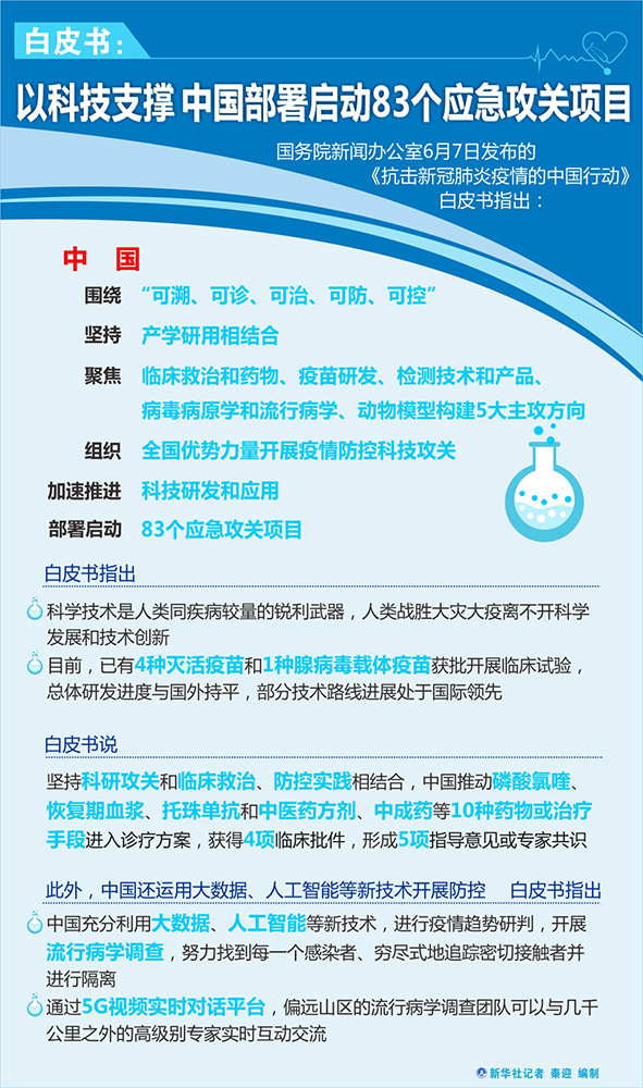 新華社北京6月7日電(記者胡喆)國(guó)務(wù)院新聞辦公室7日發(fā)布的《抗擊新冠肺炎疫情的中國(guó)行動(dòng)》白皮書指出,中國(guó)圍繞“可溯、可診、可治、可防、可控”,堅(jiān)持產(chǎn)學(xué)研用相結(jié)合,聚焦臨床救治和藥物、疫苗研發(fā)、檢測(cè)技術(shù)和產(chǎn)品、病毒病原學(xué)和流行病學(xué)、動(dòng)物模型構(gòu)建5大主攻方向,組織全國(guó)優(yōu)勢(shì)力量開展疫情防控科技攻關(guān),加速推進(jìn)科技研發(fā)和應(yīng)用,部署啟動(dòng)83個(gè)應(yīng)急攻關(guān)項(xiàng)目。