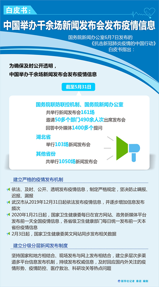新華社北京6月7日電(記者王秉陽)國務(wù)院新聞辦公室7日發(fā)布的《抗擊新冠肺炎疫情的中國行動》白皮書指出,為確保及時公開透明,中國舉辦千余場新聞發(fā)布會發(fā)布疫情信息。