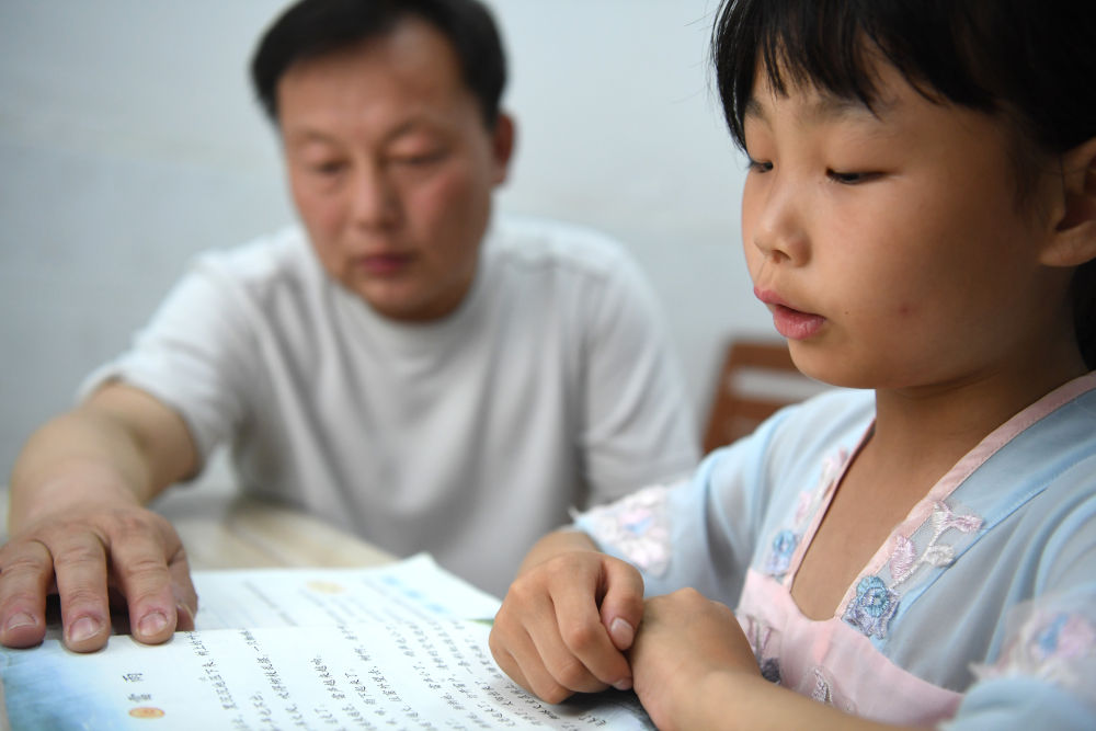 ↑?鄭加衛(wèi)在輔導(dǎo)小思揚學習。