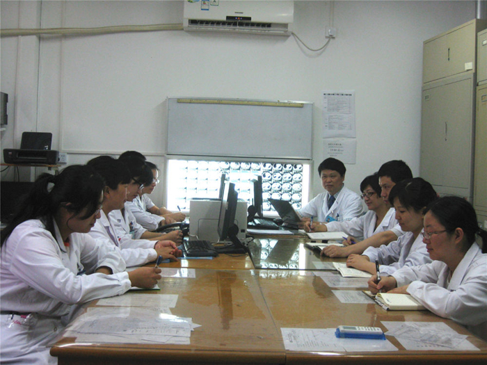 中國醫學科學院腫瘤醫院徐兵河教授(右五)、馬飛教授(右三)帶領科室共同討論乳腺癌診療中的疑難病例。(圖片由受訪者提供)