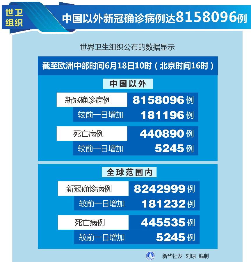 新華社日內(nèi)瓦6月18日電(記者劉曲)世界衛(wèi)生組織18日公布的最新數(shù)據(jù)顯示,中國以外新冠確診病例達到8158096例。