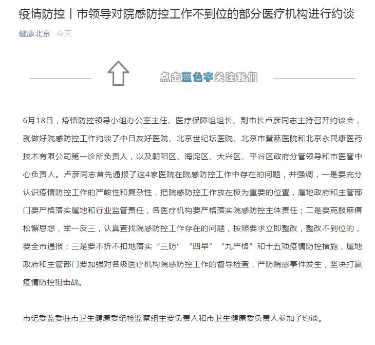 據北京市衛健委微信公眾號消息,6月18日,疫情防控領導小組辦公室主任、醫療保障組組長、副市長盧彥同志主持召開約談會,就做好院感防控工作約談了中日友好醫院、北京世紀壇醫院、北京市慧慈醫院和北京永民康醫藥技術有限公司第一診所負責人,以及朝陽區、海淀區、大興區、平谷區政府分管領導和市醫管中心負責人。