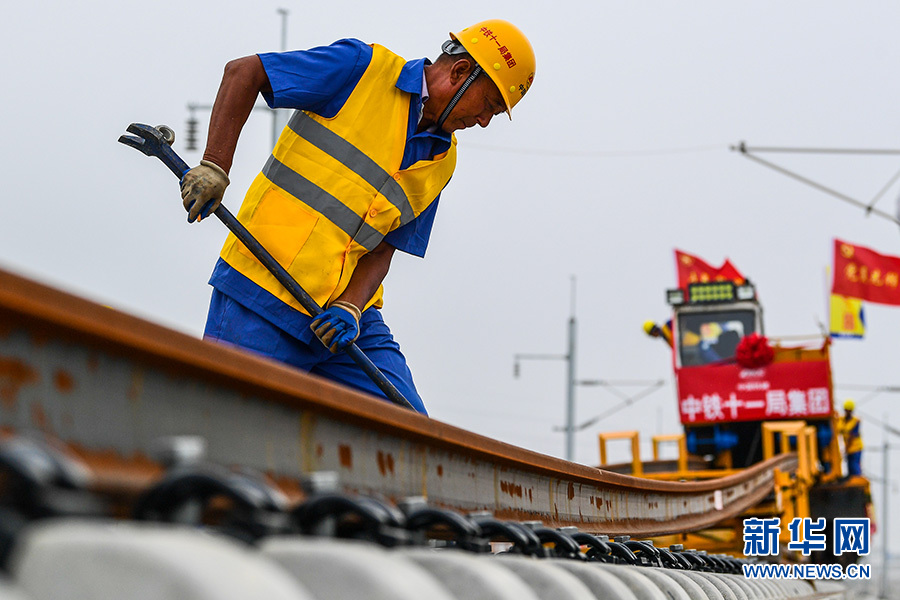 6月12日,中鐵十一局的工程人員在進行500米長軌落槽作業。 新華社記者 李博 攝(資料圖)