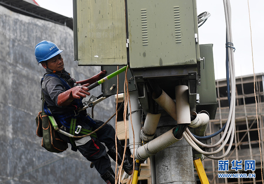 6月9日,在廣西桂林市永福縣堡里鎮,供電部門工作人員在搶修損壞的供電設備。? 新華社記者 陸波岸 攝(資料圖)