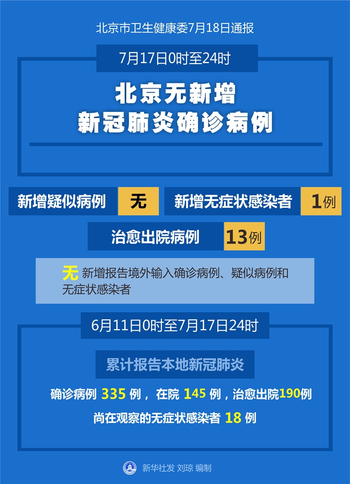 6月11日0時至7月17日24時,北京市累計(jì)報告本地新冠肺炎確診病例335例,在院145例,治愈出院190例,尚在觀察的無癥狀感染者18例。