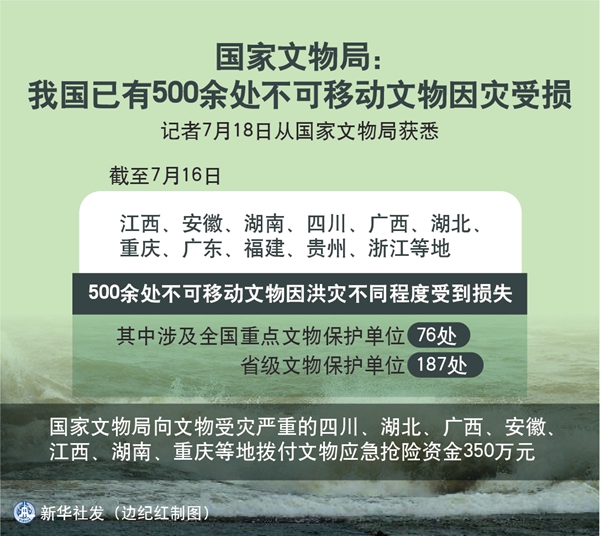 新華社北京7月18日電(記者施雨岑)記者18日從國家文物局獲悉,截至7月16日,江西、安徽、湖南、四川、廣西、湖北、重慶、廣東、福建、貴州、浙江等地500余處不可移動文物因洪災不同程度受到損失,其中涉及全國重點文物保護單位76處、省級文物保護單位187處。