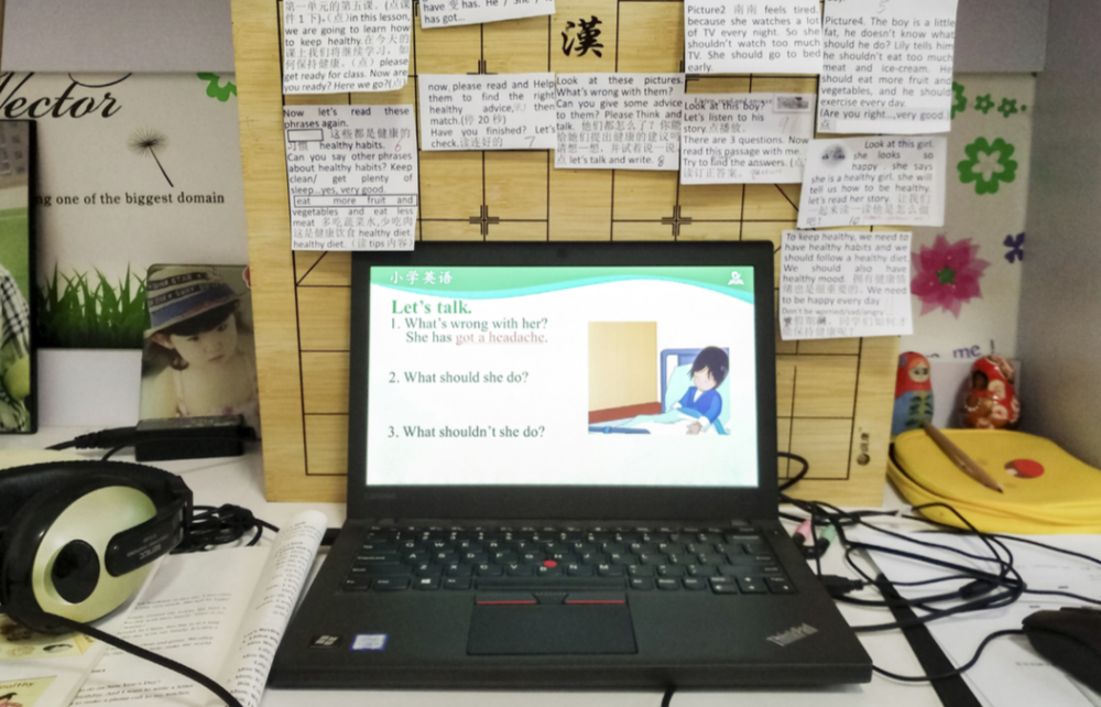 2月17日,北京中關村第三小學英語老師魯鳳玲在家中為學生錄制“國家中小學網絡云平臺”教學內容,電腦附近貼滿了用來提詞的紙條