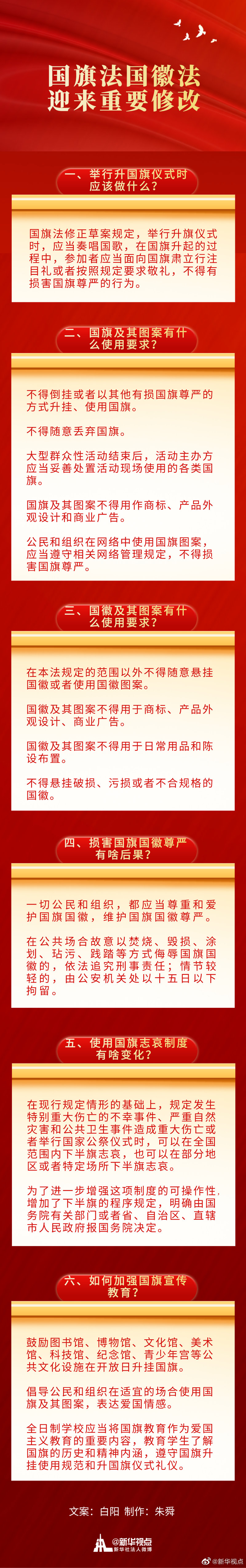 升國旗儀式上應(yīng)該做什么?參加大型群眾活動過后的國旗要怎么處理?損害國旗國徽尊嚴的行為有什么后果?8日,國旗法修正草案和國徽法修正草案提請全國人大常委會會議審議。戳大圖,了解兩法修正草案的重點↓↓ ????