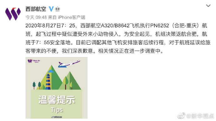 西部航空一合肥起飛客機疑遭小動物侵入 返航乘客已另搭機抵達重慶-新華網(wǎng)