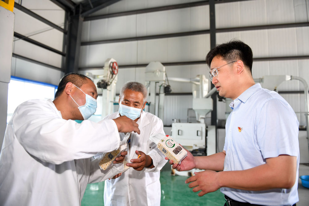 ↑在扶貧車間研究雜糧包裝