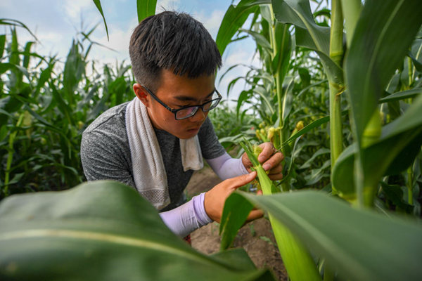在吉林省梨樹縣四棵樹鄉三棵樹村的“科技小院”試驗田,中國農業大學在讀碩士沙野查看玉米長勢(2019年7月24日攝)。新華社記者 張楠 攝?