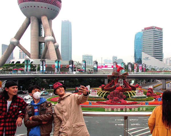 11月1日,游客在上海浦東陸家嘴環島的天橋上拍照 陳飛攝