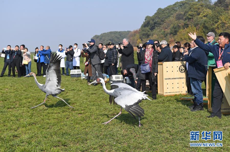 2019年12月8日,國內(nèi)多家野生動物保護(hù)機(jī)構(gòu)在江西鄱陽湖國家級自然保護(hù)區(qū)將120只被救治的珍稀候鳥成功放飛。這是工作人員放飛兩只白枕鶴。新華社記者 萬象 攝