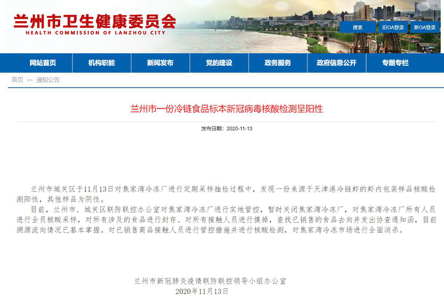 蘭州市城關區于11月13日對焦家灣冷凍廠進行定期采樣抽檢過程中,發現一份來源于天津港冷鏈蝦的蝦內包裝樣品核酸檢測陽性,其他樣品為陰性。