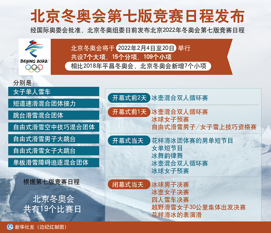新華社北京11月18日電(記者姬燁、王夢、汪涌)經國際奧委會批準,北京冬奧組委日前發(fā)布北京2022年冬奧會第七版競賽日程。隨著籌備工作的深入,北京冬奧會競賽日程仍可能調整。