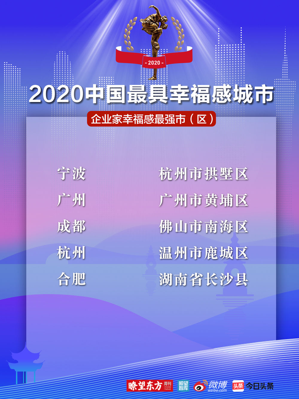 根據(jù)主觀調(diào)查問卷對(duì)企業(yè)主(家)幸福感的調(diào)查結(jié)果,組委會(huì)評(píng)選寧波、廣州、成都、杭州、合肥、杭州市拱墅區(qū)、廣州市黃埔區(qū)、佛山市南海區(qū)、溫州市鹿城區(qū)、湖南省長(zhǎng)沙縣為“企業(yè)家幸福感最強(qiáng)市(區(qū))”。