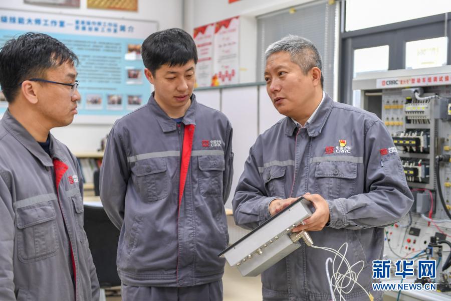 11月25日,在中車長(zhǎng)春軌道客車股份有限公司高速動(dòng)車組制造中心調(diào)試車間,羅昭強(qiáng)(右一)與同事研究高鐵列車網(wǎng)絡(luò)實(shí)驗(yàn)裝置。新華社記者 張楠 攝