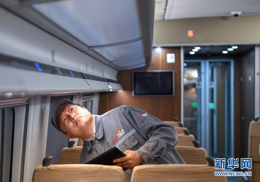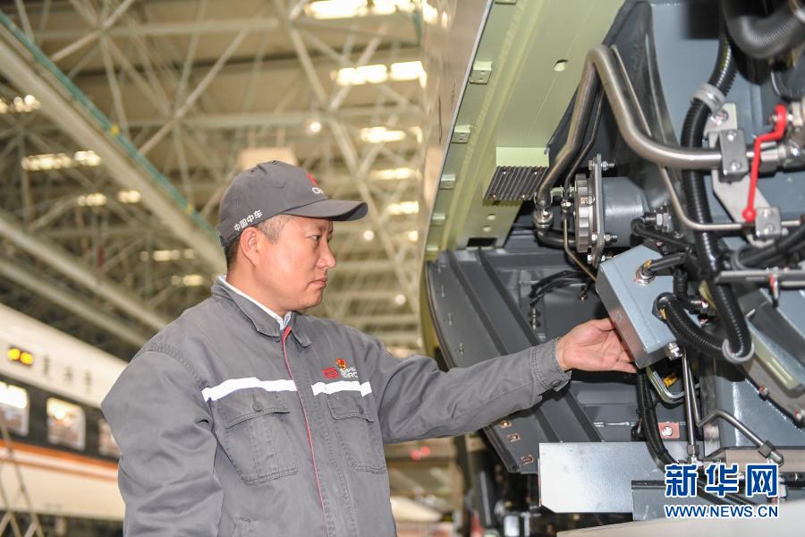 11月25日,在中車長(zhǎng)春軌道客車股份有限公司高速動(dòng)車組制造中心調(diào)試車間,羅昭強(qiáng)檢查復(fù)興號(hào)高鐵列車裝置的工作情況。新華社記者 張楠 攝