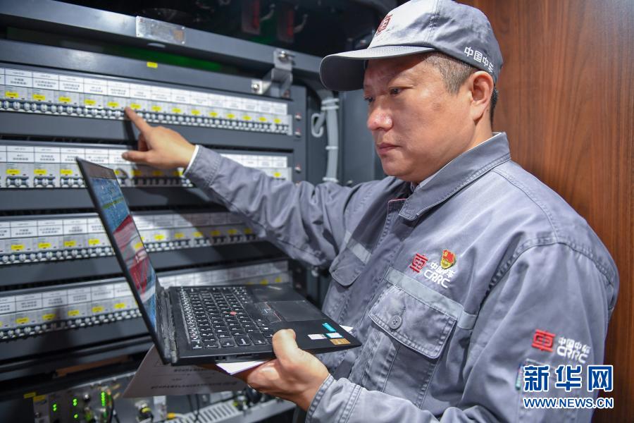 11月25日,在中車長(zhǎng)春軌道客車股份有限公司高速動(dòng)車組制造中心調(diào)試車間,羅昭強(qiáng)檢查復(fù)興號(hào)高鐵列車內(nèi)的電氣系統(tǒng)。新華社記者 張楠 攝