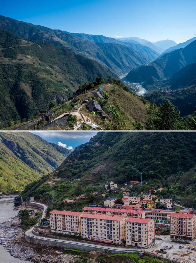 上圖是云南省福貢縣匹河怒族鄉托坪村一景(2016年11月25日攝);下圖是搬遷到怒江邊的托坪村五湖易地扶貧搬遷安置點新村(11月3日攝,無人機照片)。新華社記者 胡超 攝