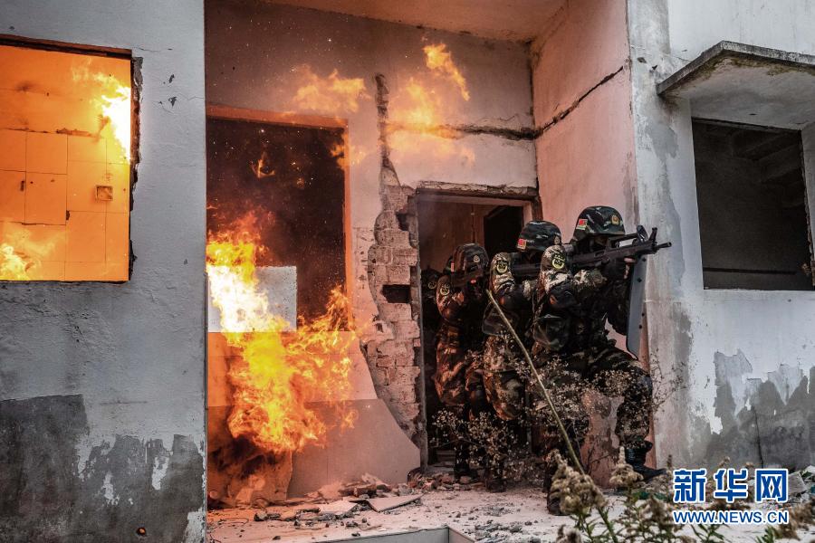 武警上??傟牂C動第一支隊特戰隊員在進行居民地搜剿訓練(12月11日攝)。新華社發(李巖 攝)