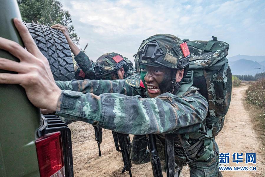 武警廣西總隊貴港支隊官兵在野外進行坡地推車訓練(12月14日攝)。新華社發(余海洋 攝)