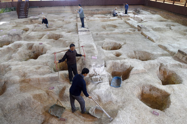 上山考古遺址公園內(nèi)發(fā)掘原址上的考古現(xiàn)場(chǎng)情景再現(xiàn)。韓傳號(hào)?攝