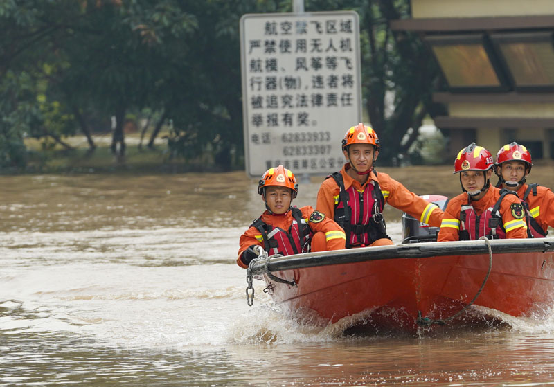 消防隊(duì)員駕駛救援船在被洪水淹沒(méi)的城市街巷中巡邏搜救。劉潺 攝