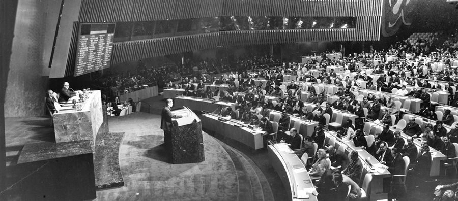1971年9月,第二十六屆聯(lián)合國大會召開。從10月18日開始,聯(lián)合國大會就恢復(fù)中華人民共和國在聯(lián)合國的代表權(quán)問題進行了一周的激烈辯論。10月25日,第二十六屆聯(lián)合國大會表決剛一結(jié)束,紐約聯(lián)合國會議大廳里立刻一片沸騰,雷鳴般的掌聲和歡呼聲一浪高過一浪,此起彼伏,經(jīng)久不息。新聞媒介評論道:“中國是在自己不在場的情況下,受到聯(lián)大三分之二以上國家的祝福,使聯(lián)合國發(fā)生根本變化。”