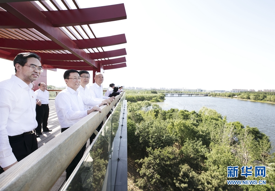 5月28日,中共中央政治局常委、國務院副總理韓正在北京市通州區調研北京城市副中心規劃建設工作。這是韓正在大運河森林公園察看大運河沿岸生態環境治理情況。新華社記者 王曄 攝