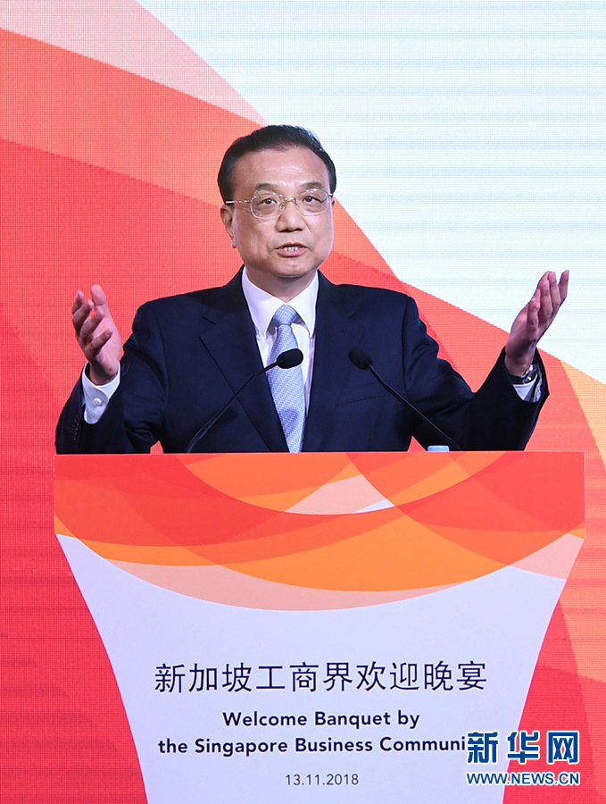 新華社新加坡11月13日電(記者張正富 楊定都)國務院總理李克強當地時間11月13日晚在新加坡出席新加坡工商聯合總會和中華總商會聯合舉辦的歡迎晚宴并致辭。