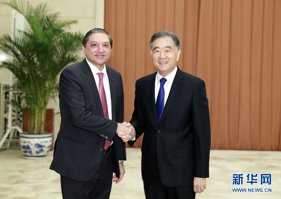 4月15日,全國政協主席汪洋在北京會見巴基斯坦參議院副主席曼德維瓦拉。 新華社記者 丁林 攝
