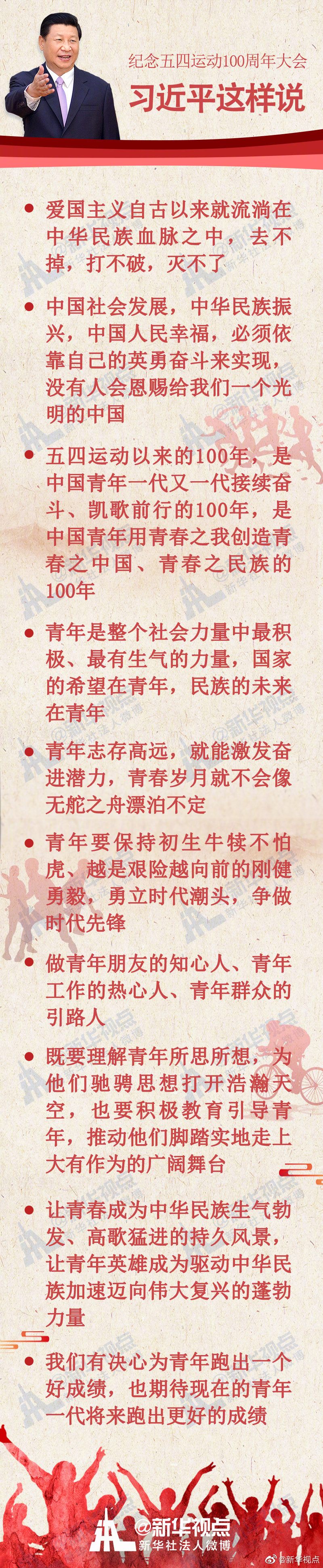 紀念五四運動100周年大會今天上午在北京人民大會堂隆重舉行,中共中央總書記、國家主席、中央軍委主席習近平出席大會并發表重要講話。戳圖看金句↓ ????