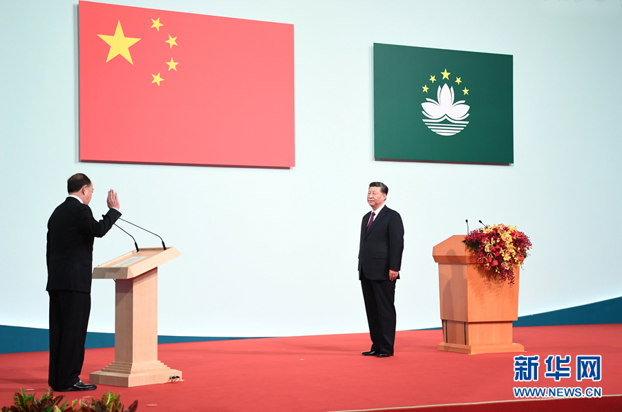 12月20日,慶祝澳門回歸祖國(guó)20周年大會(huì)暨澳門特別行政區(qū)第五屆政府就職典禮在澳門東亞運(yùn)動(dòng)會(huì)體育館隆重舉行。中共中央總書記、國(guó)家主席、中央軍委主席習(xí)近平出席并發(fā)表重要講話。這是習(xí)近平監(jiān)誓,澳門特別行政區(qū)第五任行政長(zhǎng)官賀一誠(chéng)宣誓就職。 新華社記者 謝環(huán)馳 攝
